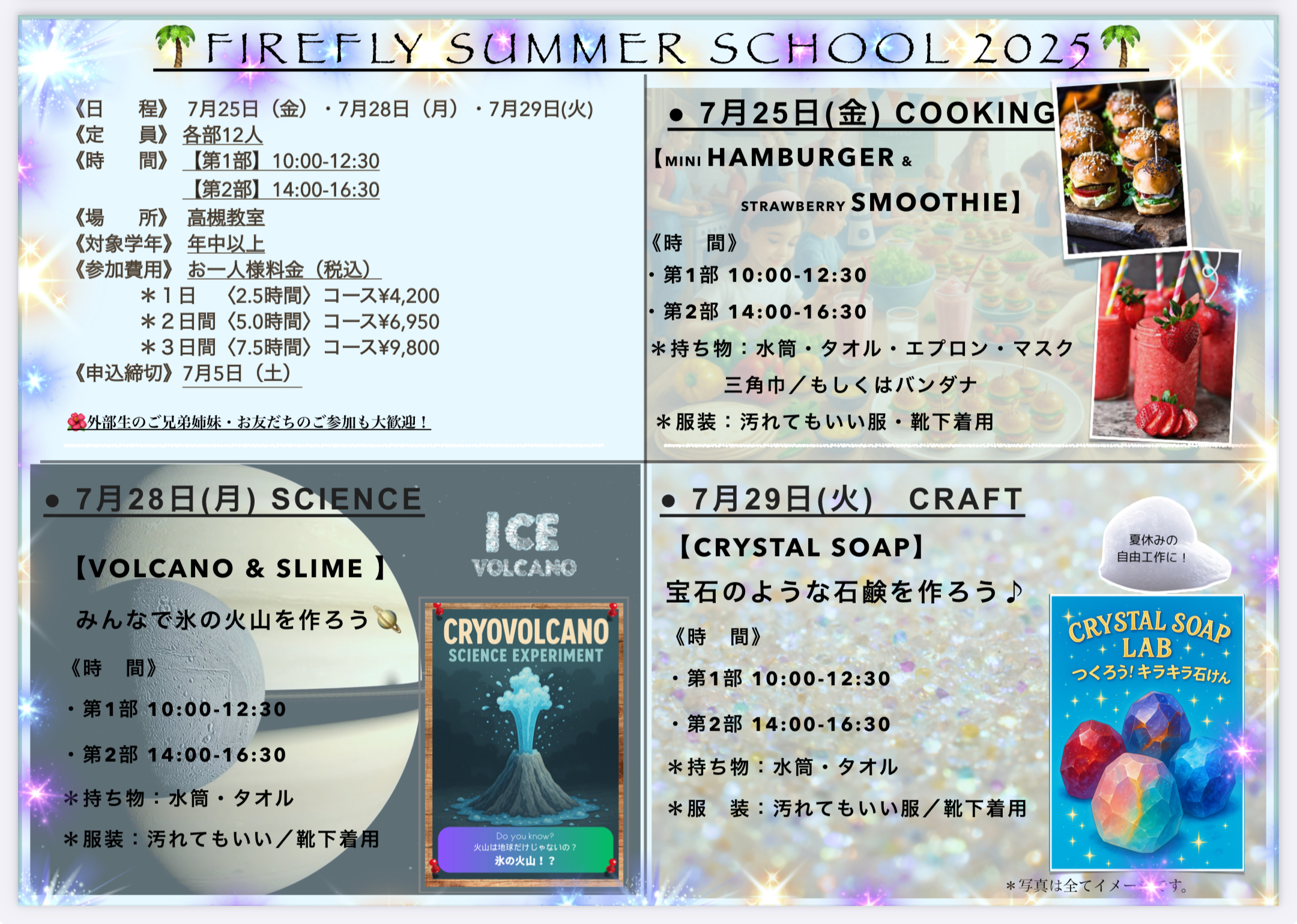 Summer Schoolとは、ネイティブの先生とともに工作やゲームを通し、自然に英語に触れながら、毎日違う内容で楽しい体験ができる毎年人気のイベントです🌻